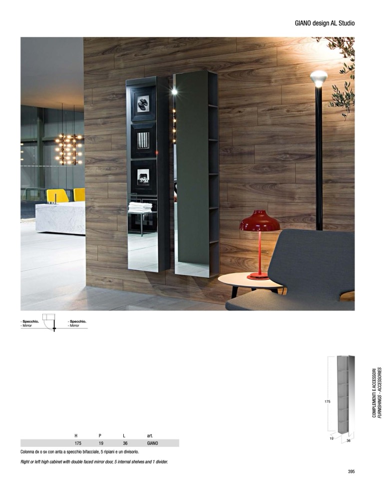 Right or left high cabinet with double faced mirror door, 5 internal shelves and 1 divider.