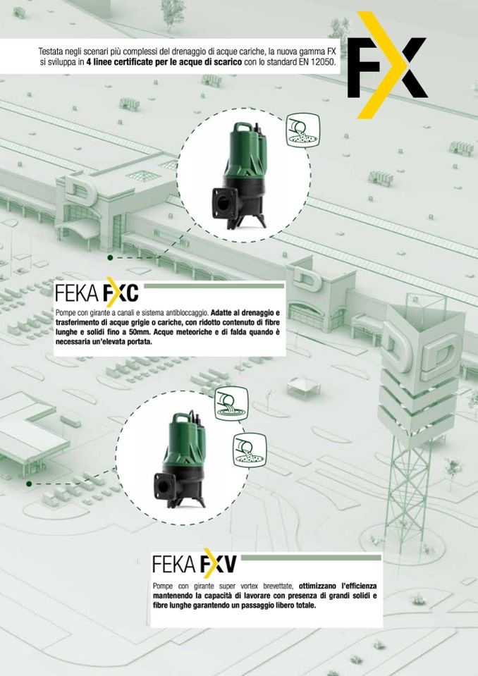 Pompe con girante a canali e sistema antibloccaggio. Adatte al drenaggio e