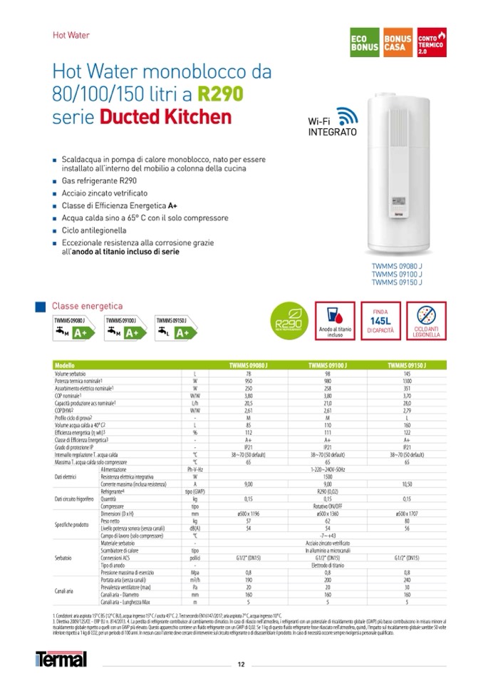 1. Condizioni: aria aspirata 15° C BS (12° C BU), acqua ingresso 15° C / uscita 45° C. 2. Test secondo EN16147/2017; aria aspirata 7° C, acqua ingresso 10° C.