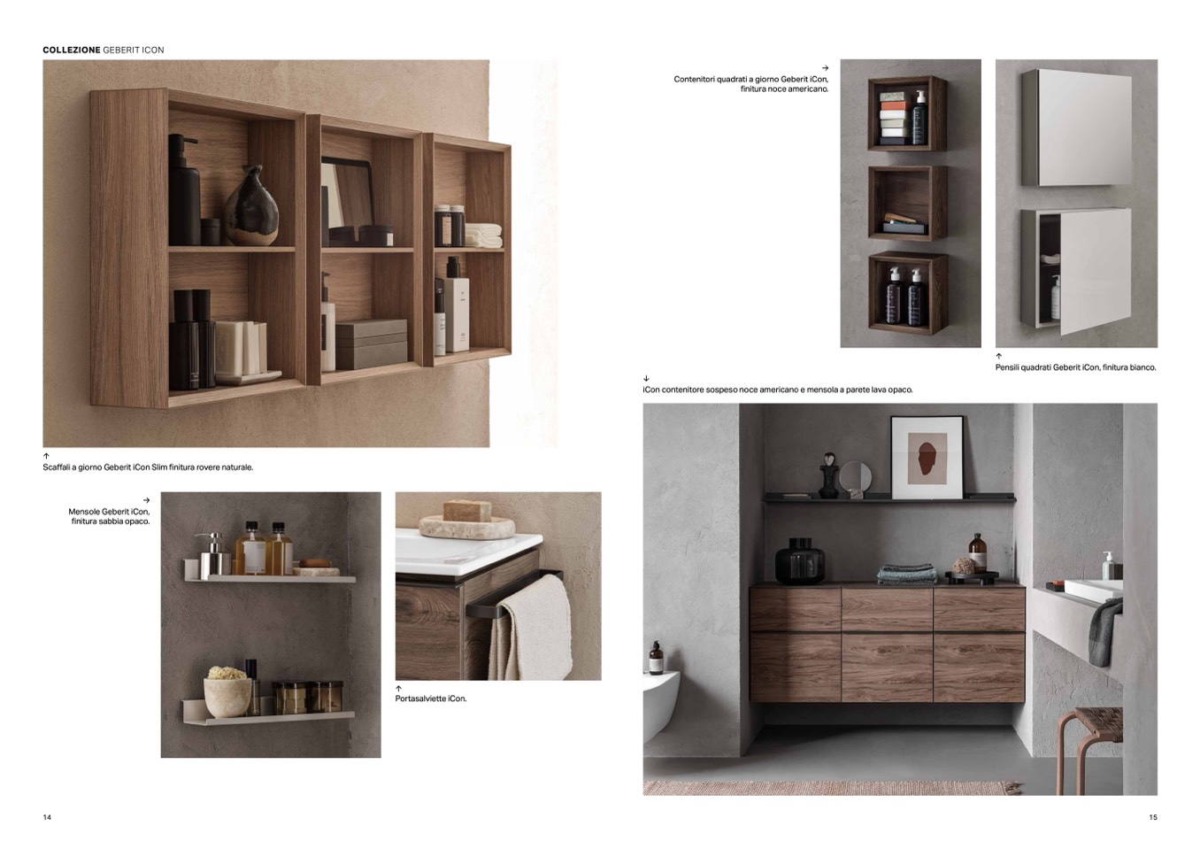 Scaffali a giorno Geberit iCon Slim finitura rovere naturale.