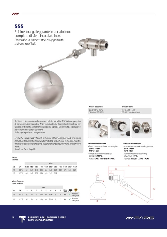 Float valve entirely made of stainless steel AISI 304, including ball made of stainless