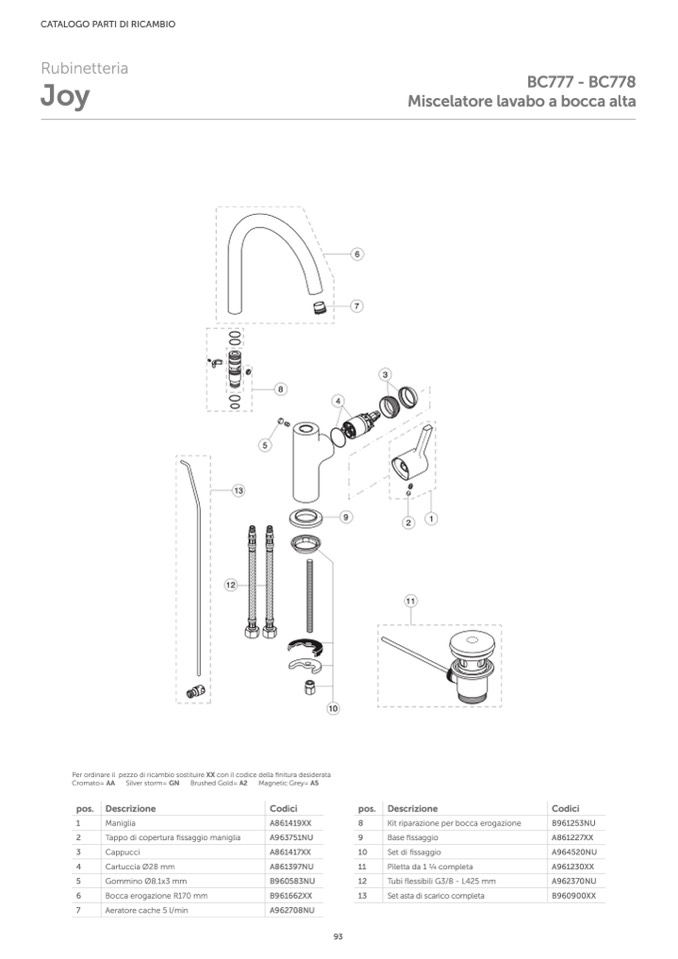 Per ordinare il pezzo di ricambio sostituire XX con il codice della finitura desiderata