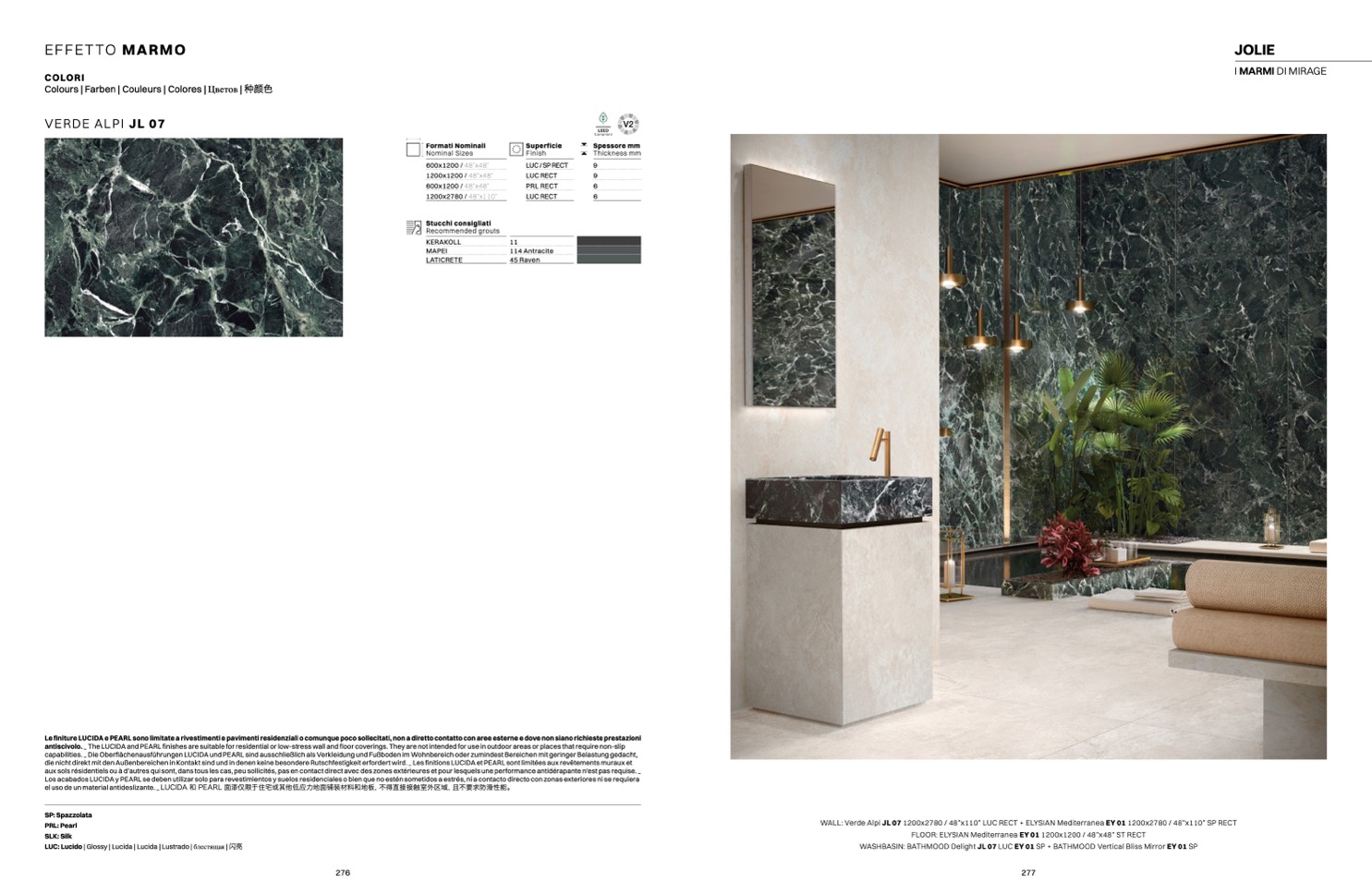 Le finiture LUCIDA e PEARL sono limitate a rivestimenti e pavimenti residenziali o comunque poco sollecitati, non a diretto contatto con aree esterne e dove non siano richieste prestazioni