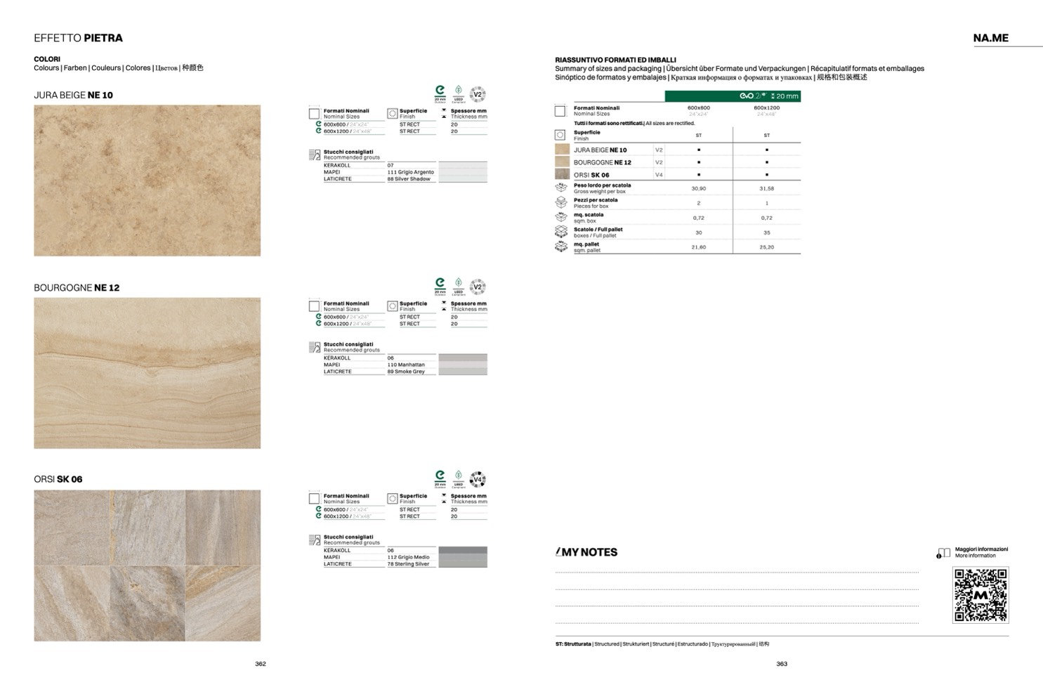Summary of sizes and packaging |