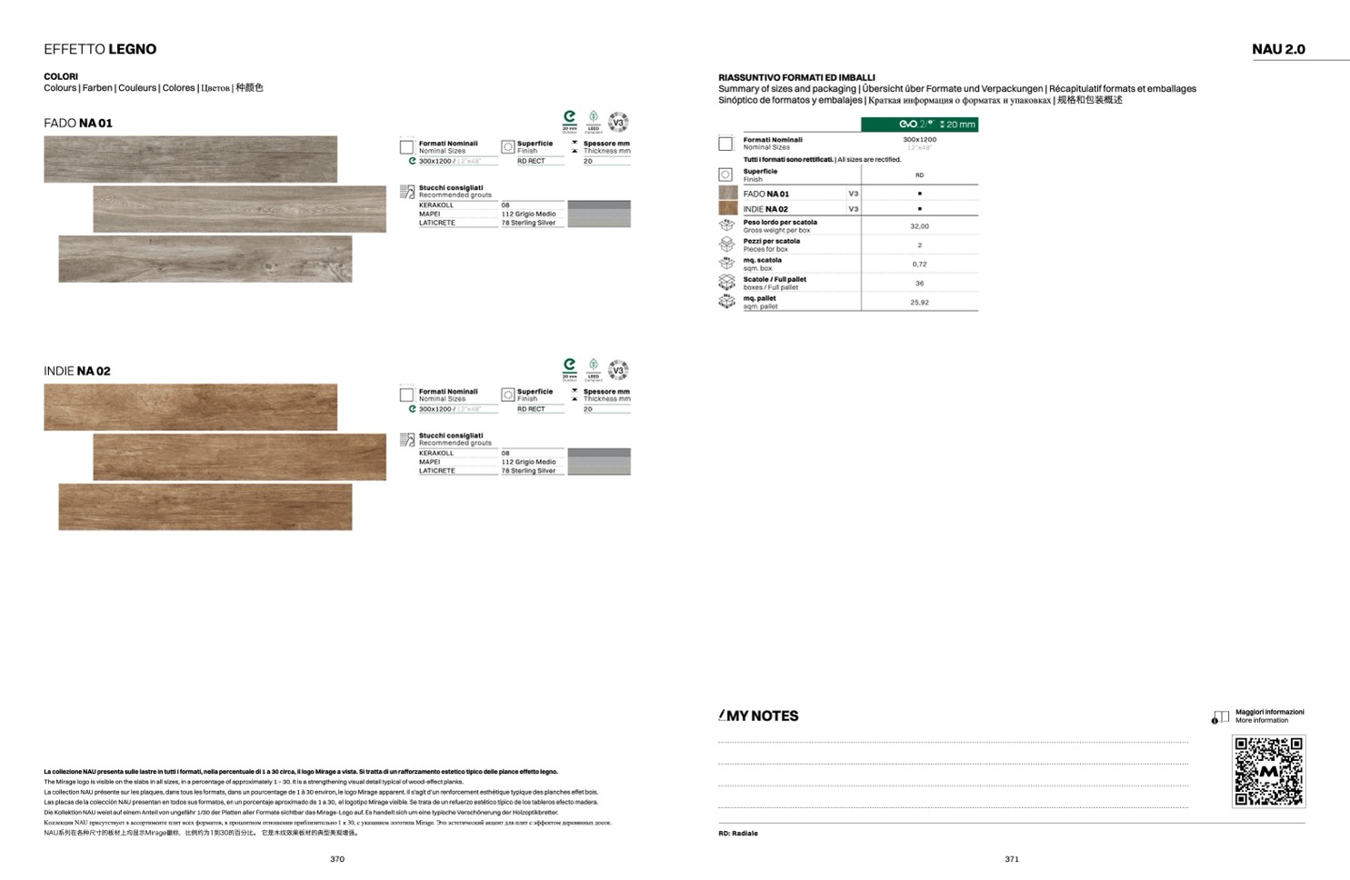 La collezione NAU presenta sulle lastre in tutti i formati, nella percentuale di 1 a 30 circa, il logo Mirage a vista. Si tratta di un rafforzamento estetico tipico delle plance effetto legno.