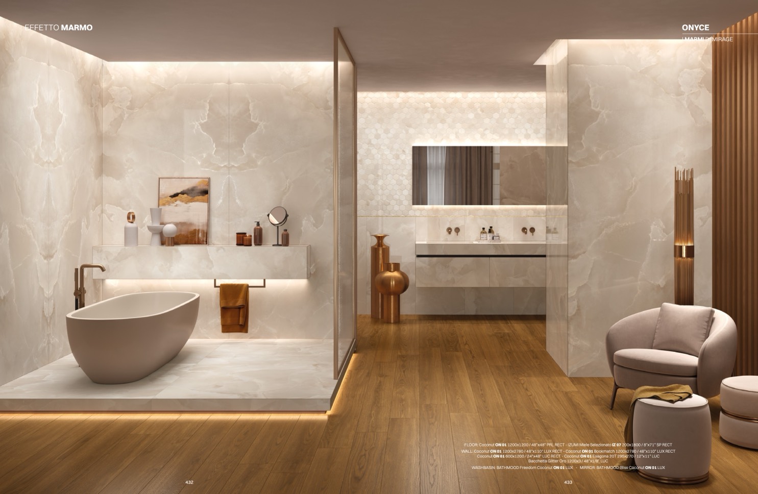 FLOOR: Coconut ON 01 1200x1200 / 48”x48” PRL RECT - IZUMI Miele Selezionato IZ 07 200x1800 / 8”x71” SP RECT