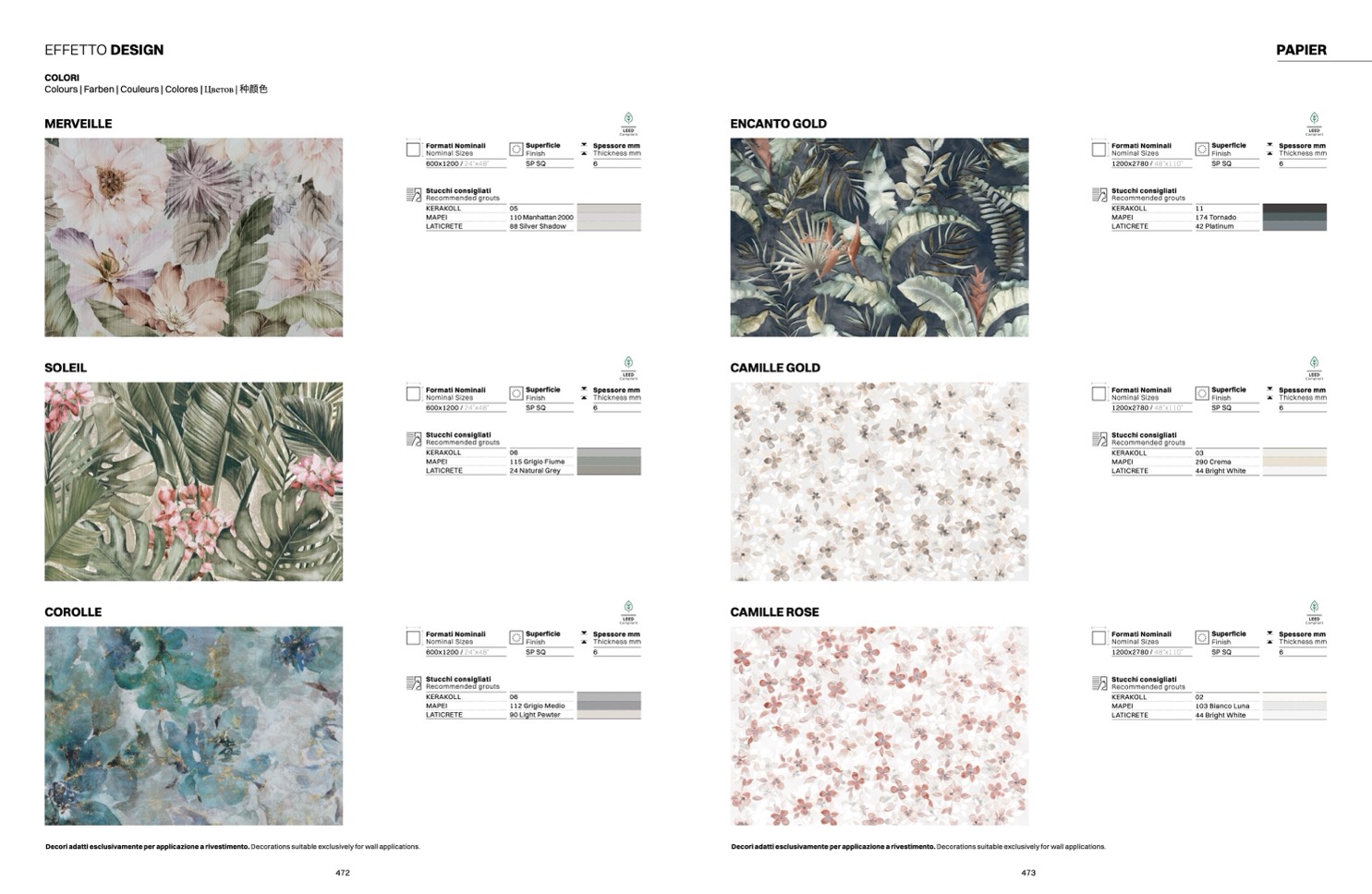 Decori adatti esclusivamente per applicazione a rivestimento. Decorations suitable exclusively for wall applications.