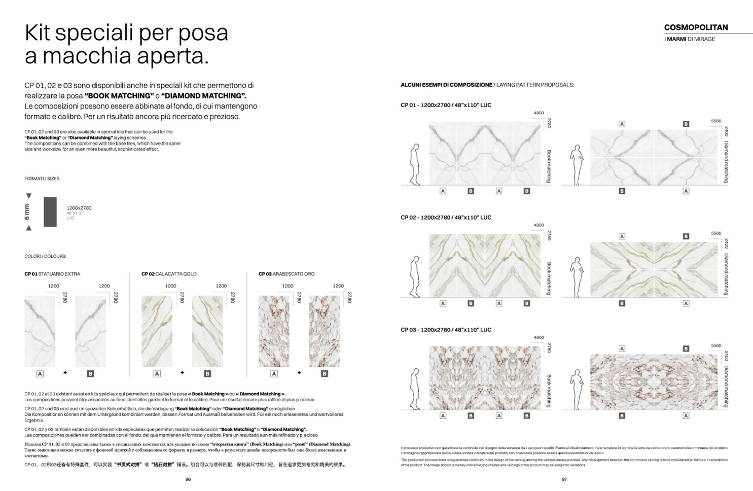 CP 01, 02 y 03 también están disponibles en kits especiales que permiten realizar la colocación “Book Matching” o “Diamond Matching”.
