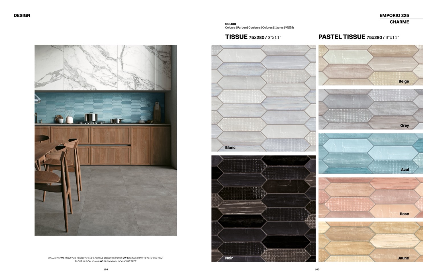 WALL: CHARME Tissue Azul 75x280 / 3”x11” | JEWELS Statuario Lunensis JW 12 1200x2780 / 48”x110” LUC RECT