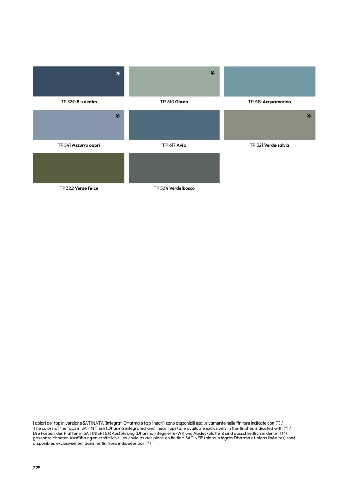I colori dei top in versione SATINATA (integrati Dharma e top lineari) sono disponibili esclusivamente nelle finiture indicate con (*) /