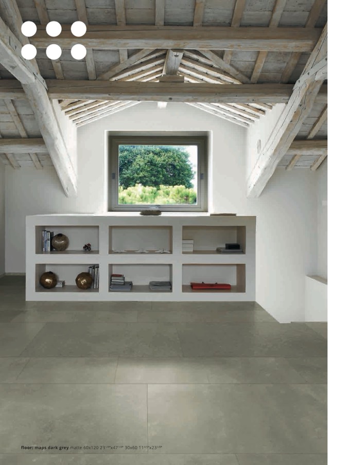 floor: maps dark grey matte 60x120 235/8”x471/4” 30x60 114/5”x235/8”