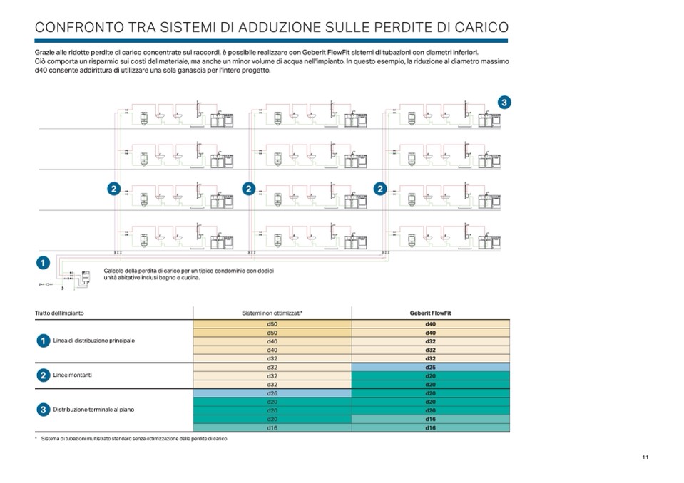 Grazie alle ridotte perdite di carico concentrate sui raccordi, è possibile realizzare con Geberit FlowFit sistemi di tubazioni con diametri inferiori.