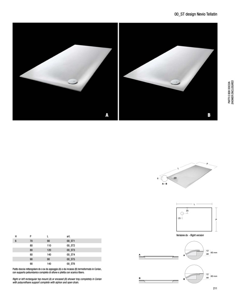 Piatto doccia rettangolare dx o sx da appoggio (A) o da incasso (B) termoformato in Corian,