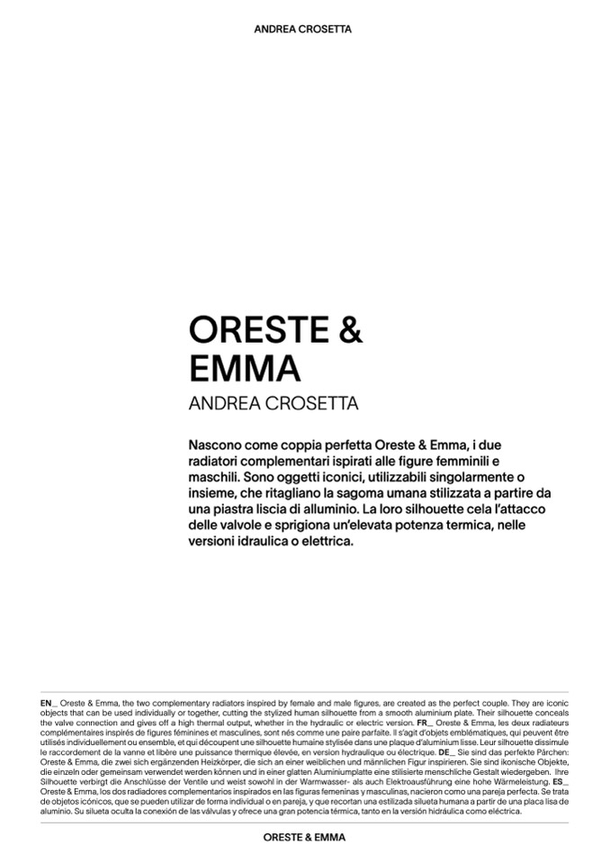 EN_ Oreste & Emma, the two complementary radiators inspired by female and male figures, are created as the perfect couple. They are iconic