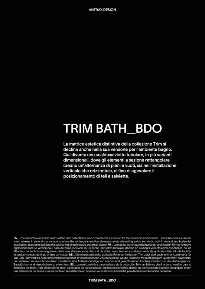 EN_ The distinctive aesthetic matrix of the Trim collection is also expressed in its version for the bathroom environment. Here it becomes a tubular