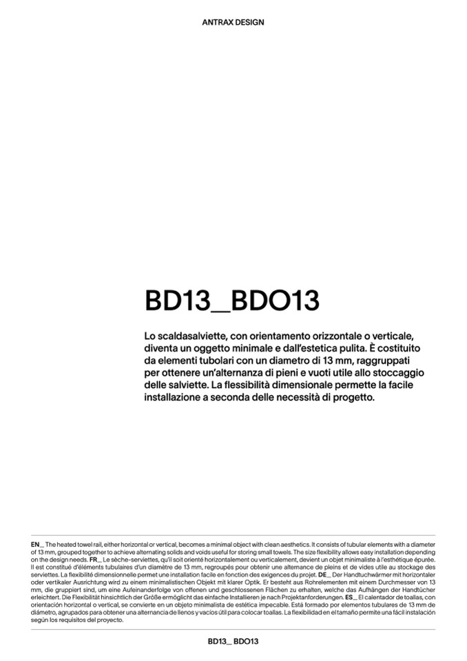 EN_ The heated towel rail, either horizontal or vertical, becomes a minimal object with clean aesthetics. It consists of tubular elements with a diameter