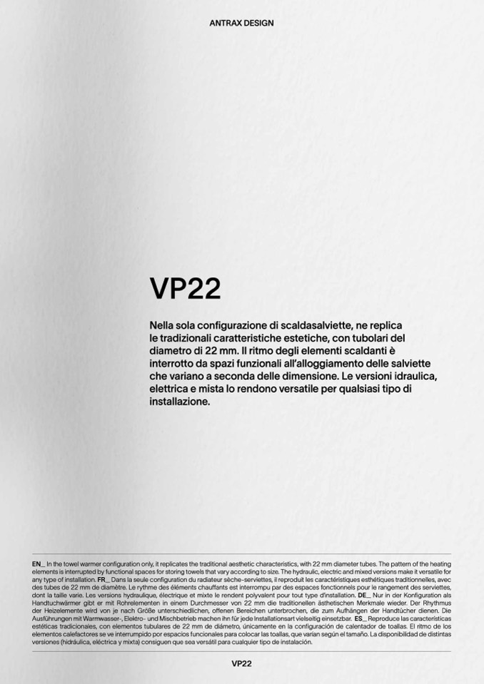 EN_ In the towel warmer configuration only, it replicates the traditional aesthetic characteristics, with 22 mm diameter tubes. The pattern of the heating
