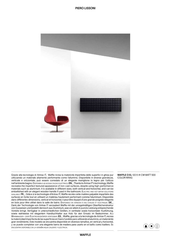 nell’ambiente bagno. DispOnibiLe aD aCqua CaLDa e eLeTTRiCO. EN_ Thanks to Antrax IT’s technology, Waffle