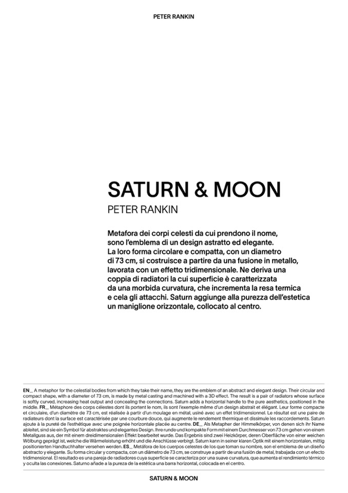 is softly curved, increasing heat output and concealing the connections. Saturn adds a horizontal handle to the pure aesthetics, positioned in the