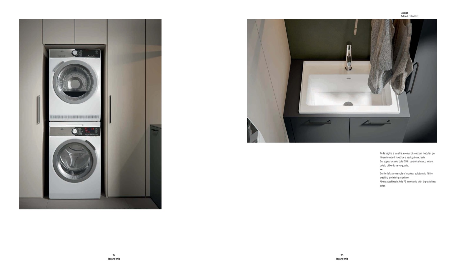 Qui sopra: lavatoio Jolly 75 in ceramica bianco lucido,
