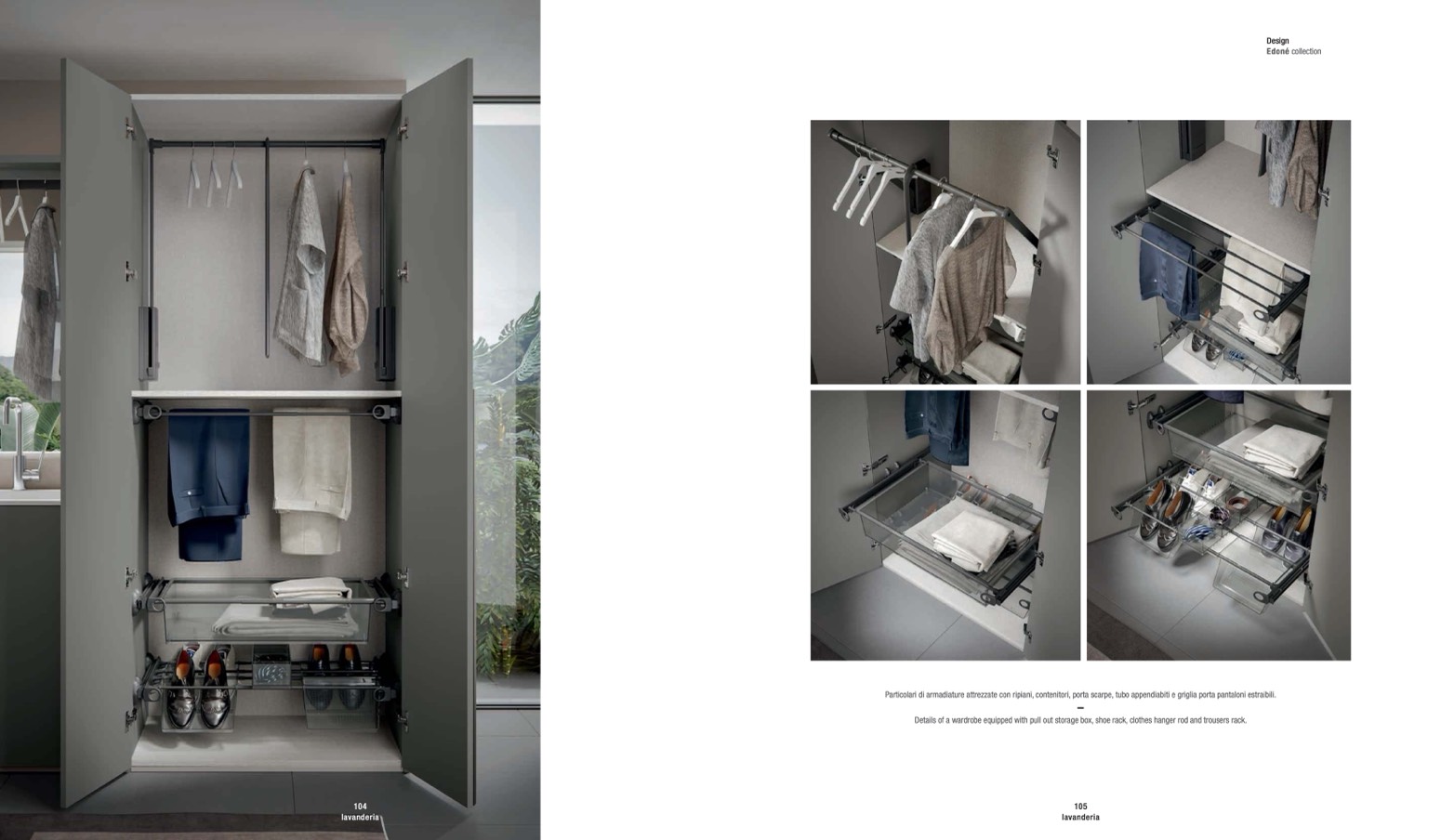 Particolari di armadiature attrezzate con ripiani, contenitori, porta scarpe, tubo appendiabiti e griglia porta pantaloni estraibili.