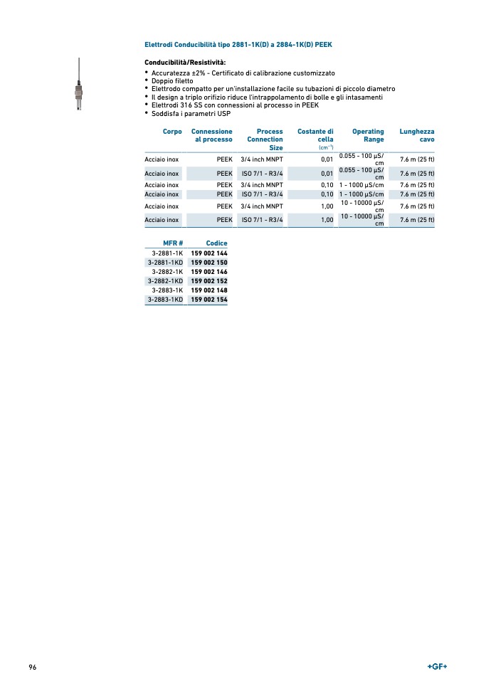 • Elettrodi 316 SS con connessioni al processo in PEEK