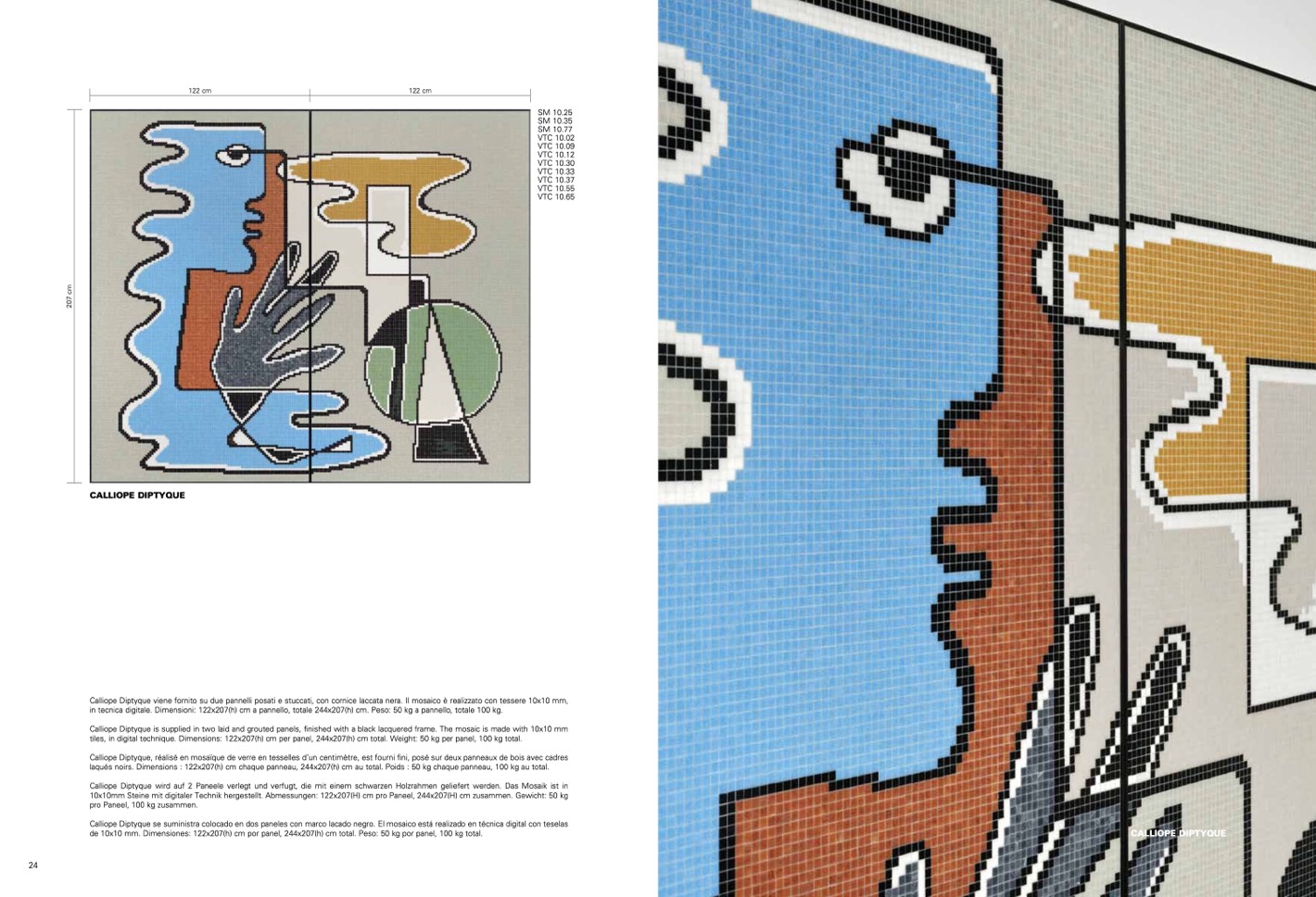Calliope Diptyque, réalisé en mosaïque de verre en tesselles d’un centimètre, est fourni fini, posé sur deux panneaux de bois avec cadres