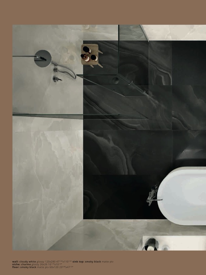 wall: cloudy white glossy 120x280 471/4”x1101/4” sink top: smoky black matte pt