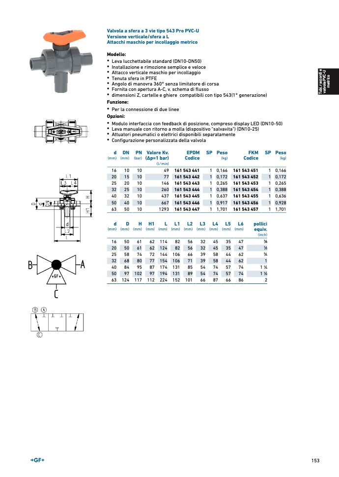 Valvola a sfera a 3 vie tipo 543 Pro PVC-