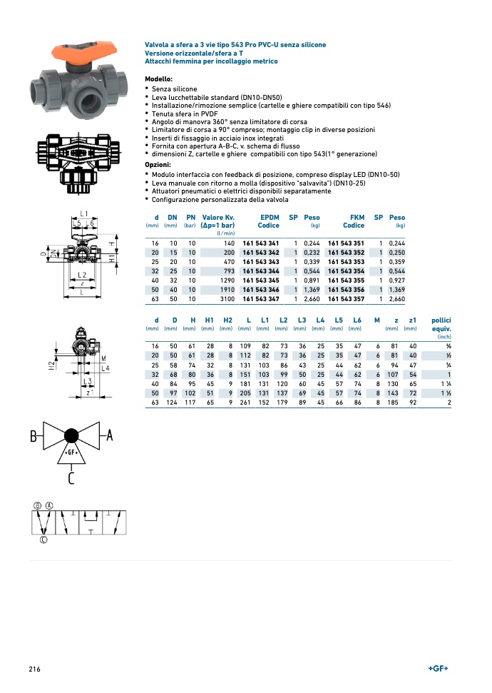 Valvola a sfera a 3 vie tipo 543 Pro PVC-U senza silicon