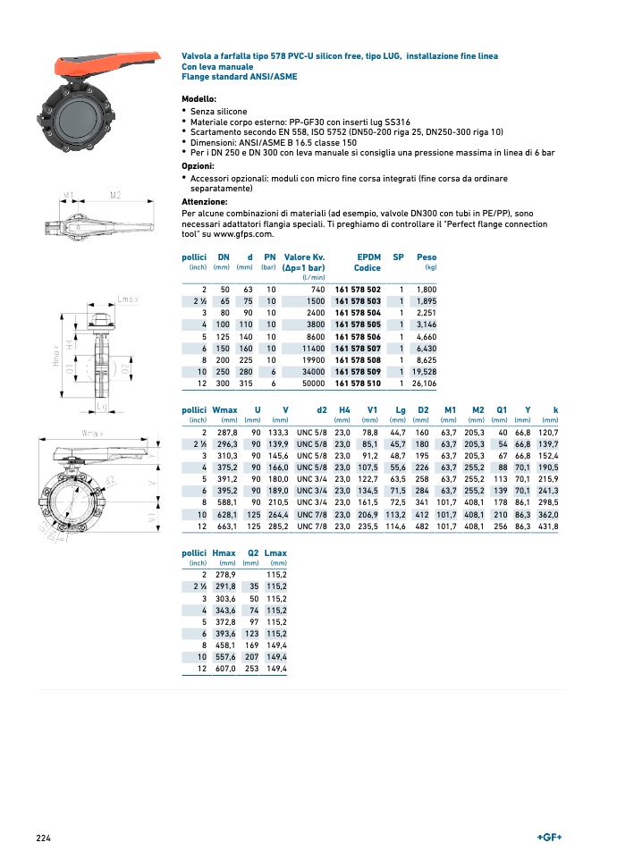 Valvola a farfalla tipo 578 PVC-U silicon free, tipo LUG, installazione fine line