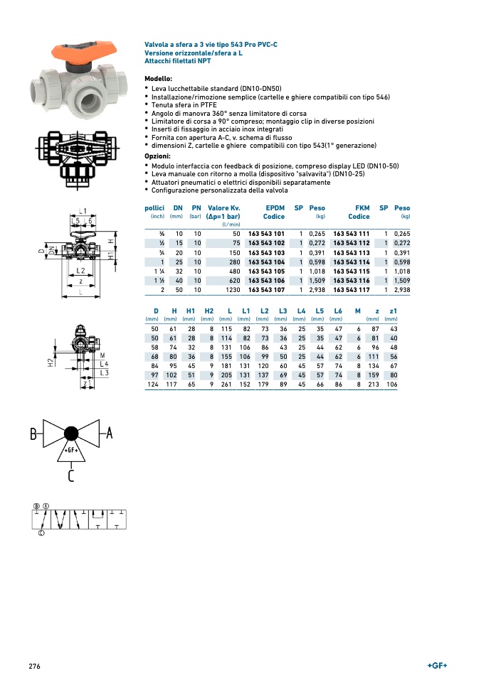 Valvola a sfera a 3 vie tipo 543 Pro PVC-