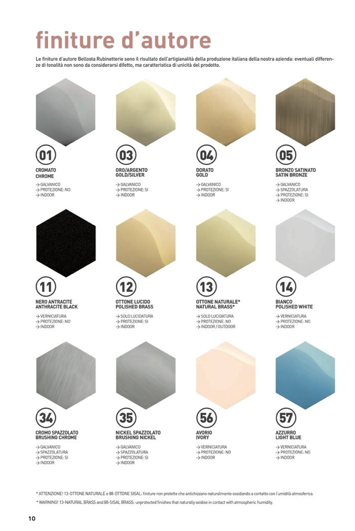 * ATTENZIONE! 13-OTTONE NATURALE e 88-OTTONE SISAL: finiture non protette che antichizzano naturalmente ossidando a contatto con l’umidità atmosferica.