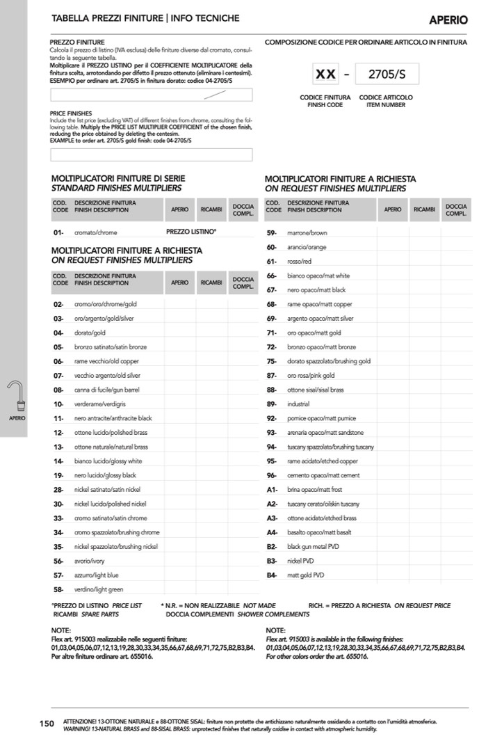 WARNING! 13-NATURAL BRASS and 88-SISAL BRASS: unprotected finishes that naturally oxidise in contact with atmospheric humidity.