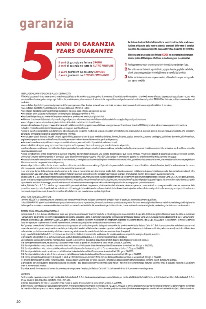• in caso di prodotti con soffioni doccia, si raccomanda un utilizzo frequente (almeno una volta ogni 5 giorni) onde prevenire la formazione di calcare. Un utilizzo saltuario favorisce, infatti, la sedimentazione del calcare