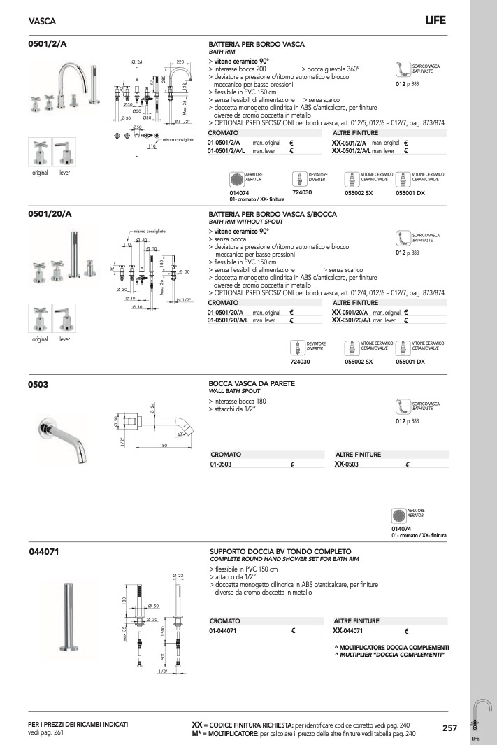 > OPTIONAL PREDISPOSIZIONI per bordo vasca, art. 012/4, 012/6 e 012/7, pag. 873/874