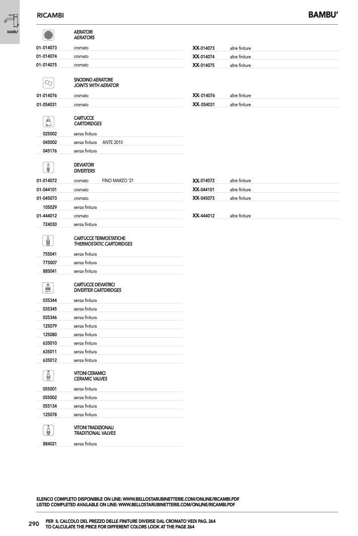 ELENCO COMPLETO DISPONIBILE ON LINE: WWW.BELLOSTARUBINETTERIE.COM/ONLINE/RICAMBI.PDF