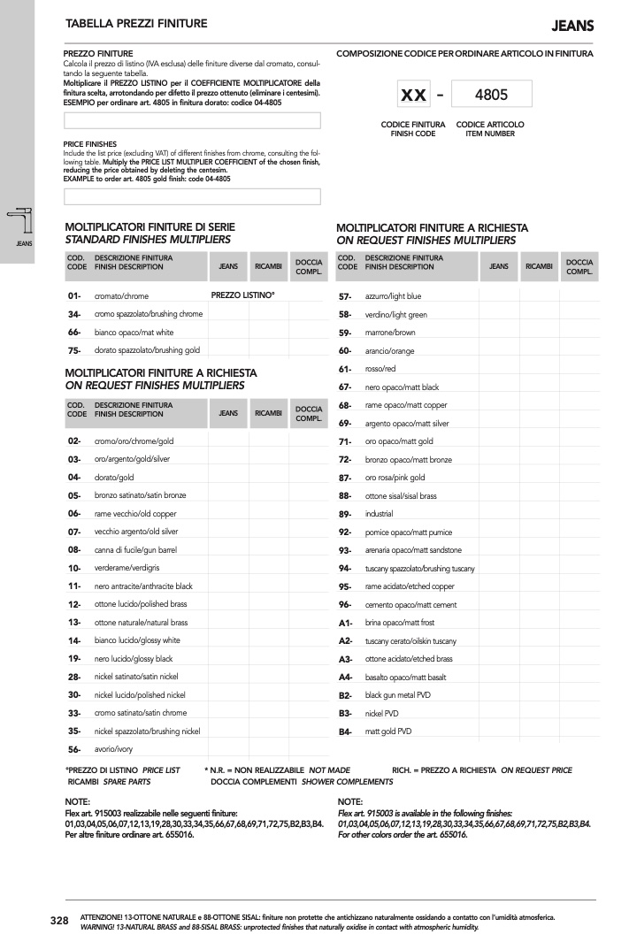 WARNING! 13-NATURAL BRASS and 88-SISAL BRASS: unprotected finishes that naturally oxidise in contact with atmospheric humidity.