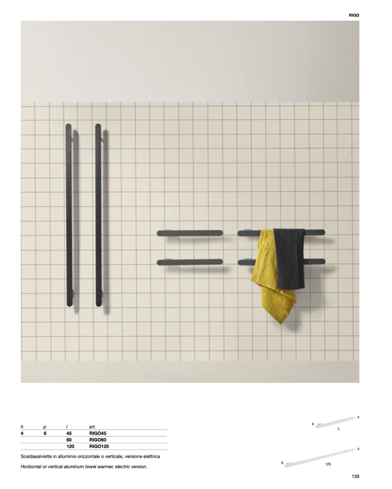 Horizontal or vertical aluminum towel warmer, electric version.