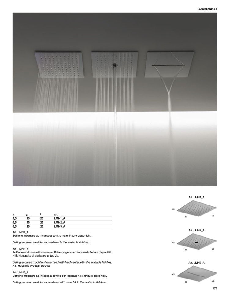 Soffione modulare ad incasso a soffitto con cascata nelle finiture disponibili.