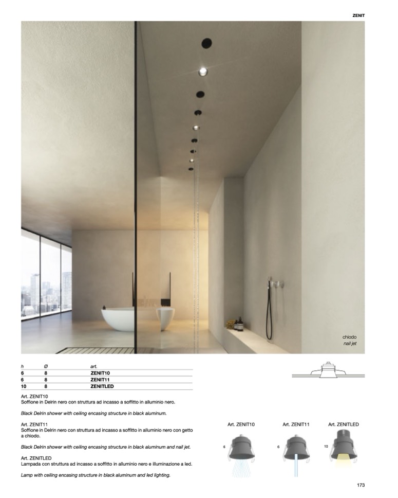 Soffione in Delrin nero con struttura ad incasso a soffitto in alluminio nero con getto