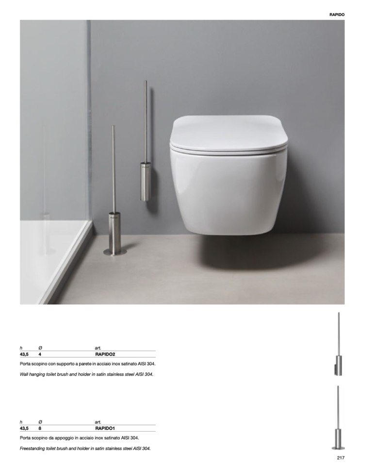 Wall hanging toilet brush and holder in satin stainless steel AISI 304.
