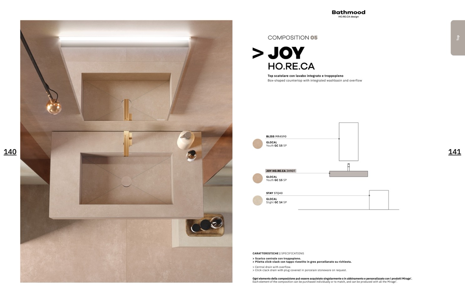 > Click-clack drain with plug covered in porcelain stoneware on request.