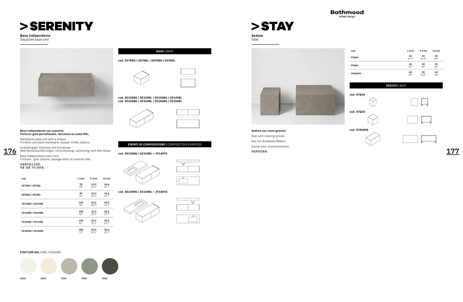 Finishes: porcelain stoneware, lacquer in RAL colours.
