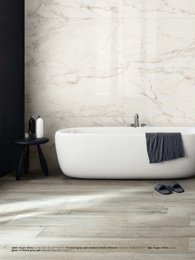 wall: magic white lucido 60x120 235/8”x471/4” / hi-wood grey oak modulo listello sfalsato naturale 15x40 6”x153/4” top: magic white lucido