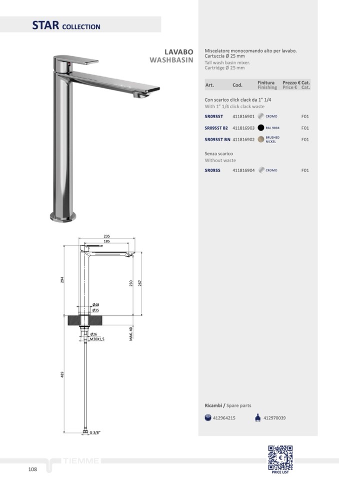 Miscelatore monocomando alto per lavabo.