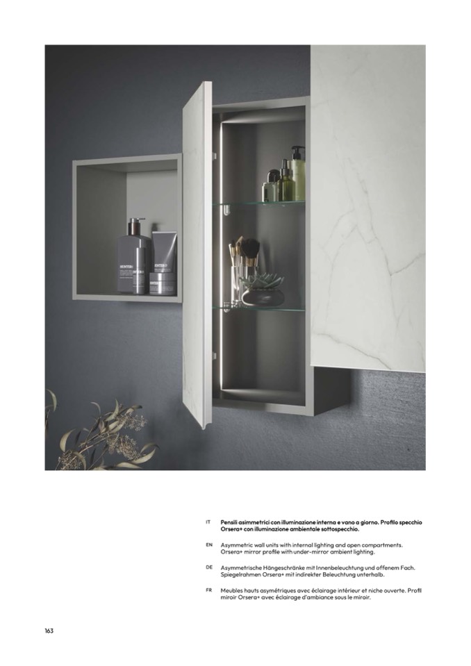 Pensili asimmetrici con illuminazione interna e vano a giorno. Profilo specchio