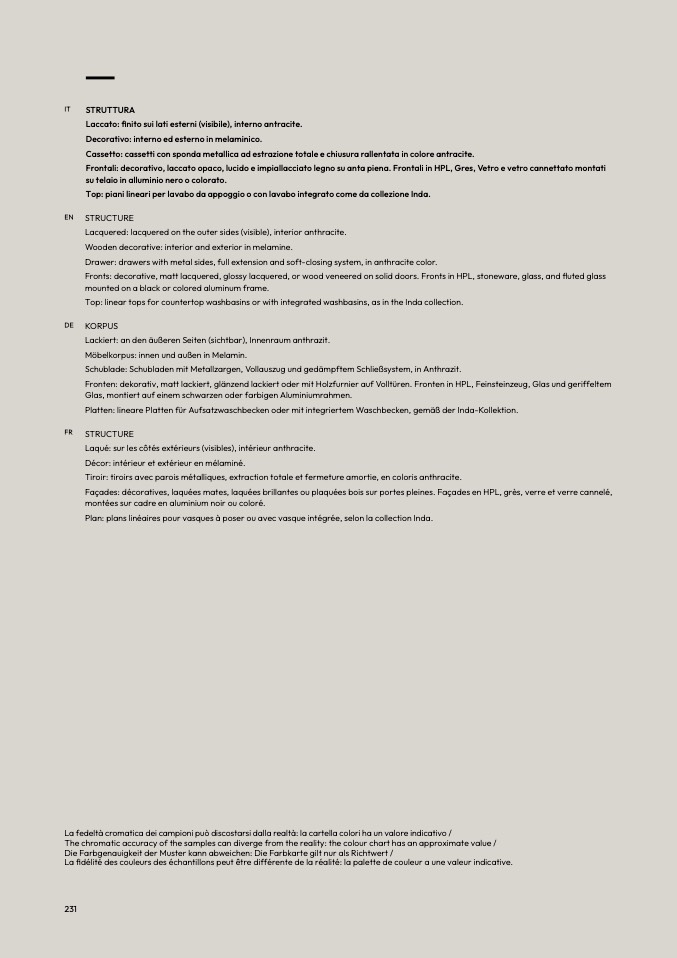 Fronts: decorative, matt lacquered, glossy lacquered, or wood veneered on solid doors. Fronts in HPL, stoneware, glass, and