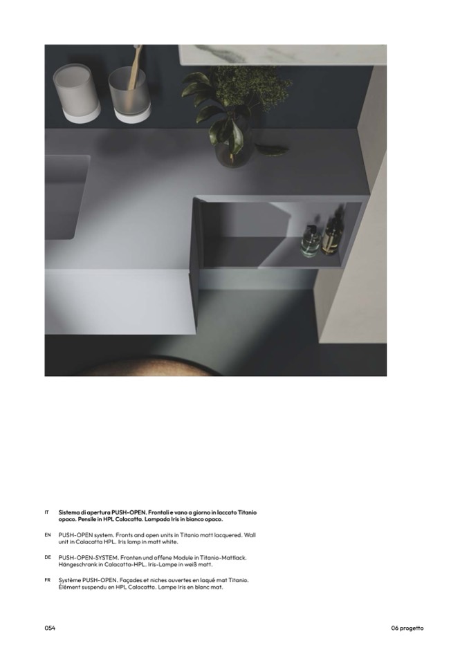 PUSH-OPEN system. Fronts and open units in Titanio matt lacquered. Wal
