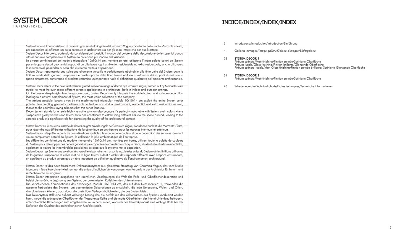 System Decor refers to the new frost-resistant glazed stoneware range of decors by Ceramica Vogue, carried out by Marcante-Testa